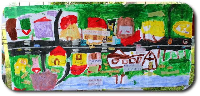 Come vi dico spesso, abitiamo in un paese davvero piccolino. La mia bambina sta crescendo dove sono cresciuta io, il suo asilo si trova nella stanza in fianco alla mia vecchia scuola elementare (che c'è tutt'ora, e che credo lei frequenterà). Nei piccoli paesi, nelle frazioni soprattutto, le proposte più o meno "ludiche" che riguardano la comunità sono sempre poche, sia che si tratti di persone adulte, sia che si tratti dei nostri piccini. Questa mattina invece, abbiamo assistito con immenso piacere ad una mostra di disegni, tenutasi in piazza del paese, realizzati dai bambini della scuola materna e dai bambini delle elementari. E' stato chiesto loro, di disegnare ciò che vorrebbero ci fosse in questa piccola realtà, e come sempre, dalle loro manine è uscito qualcosa di splendido e meraviglioso. Mi scuso in anticipo con qualche bimbo, perchè non credo di aver fotografato ogni singolo disegno... Perdonatemi cucciolini!